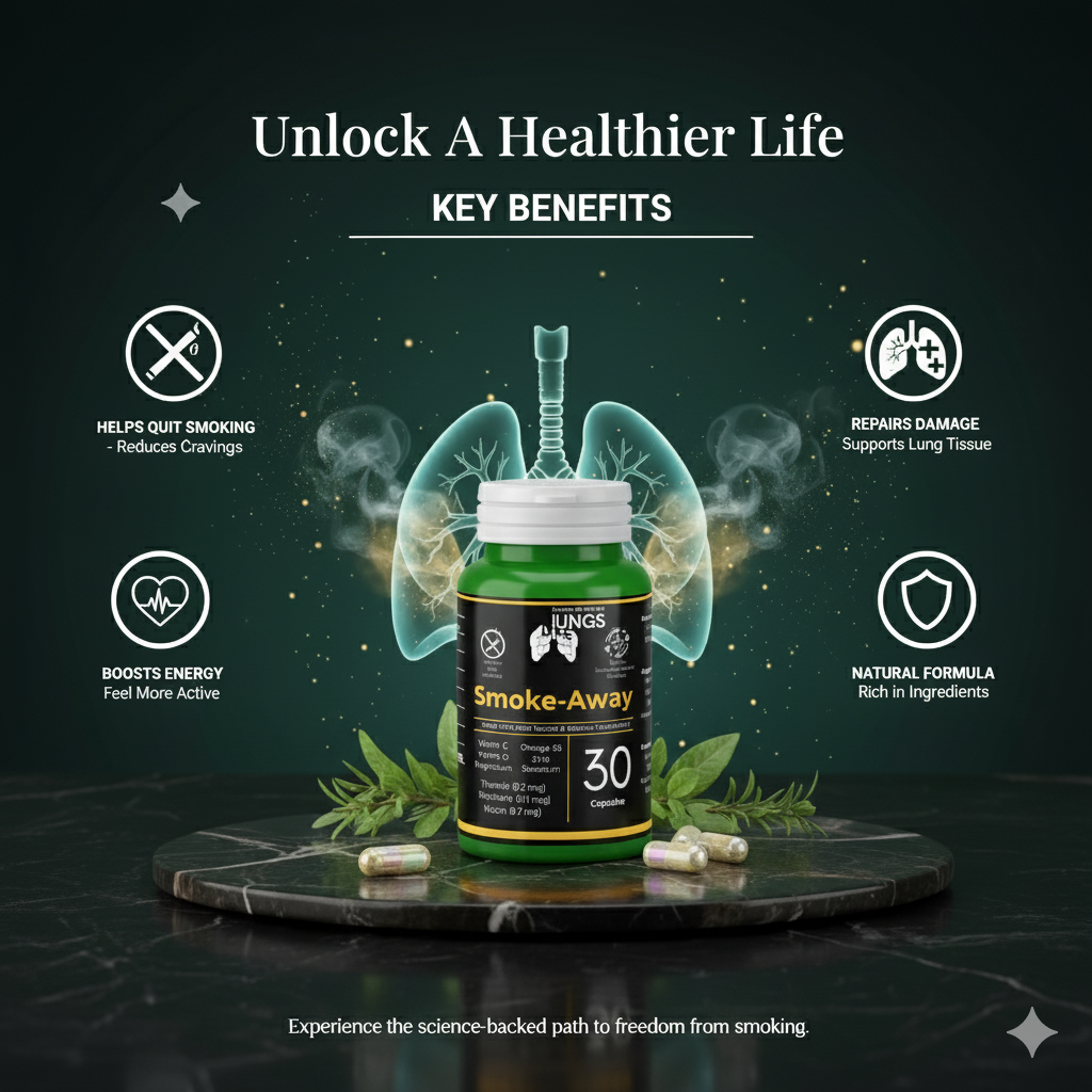 Support your journey to a smoke-free life with natural, non-addictive ingredients. Smoke-Away helps reduce cravings, repair lung damage, and promote cleaner, healthier breathing.